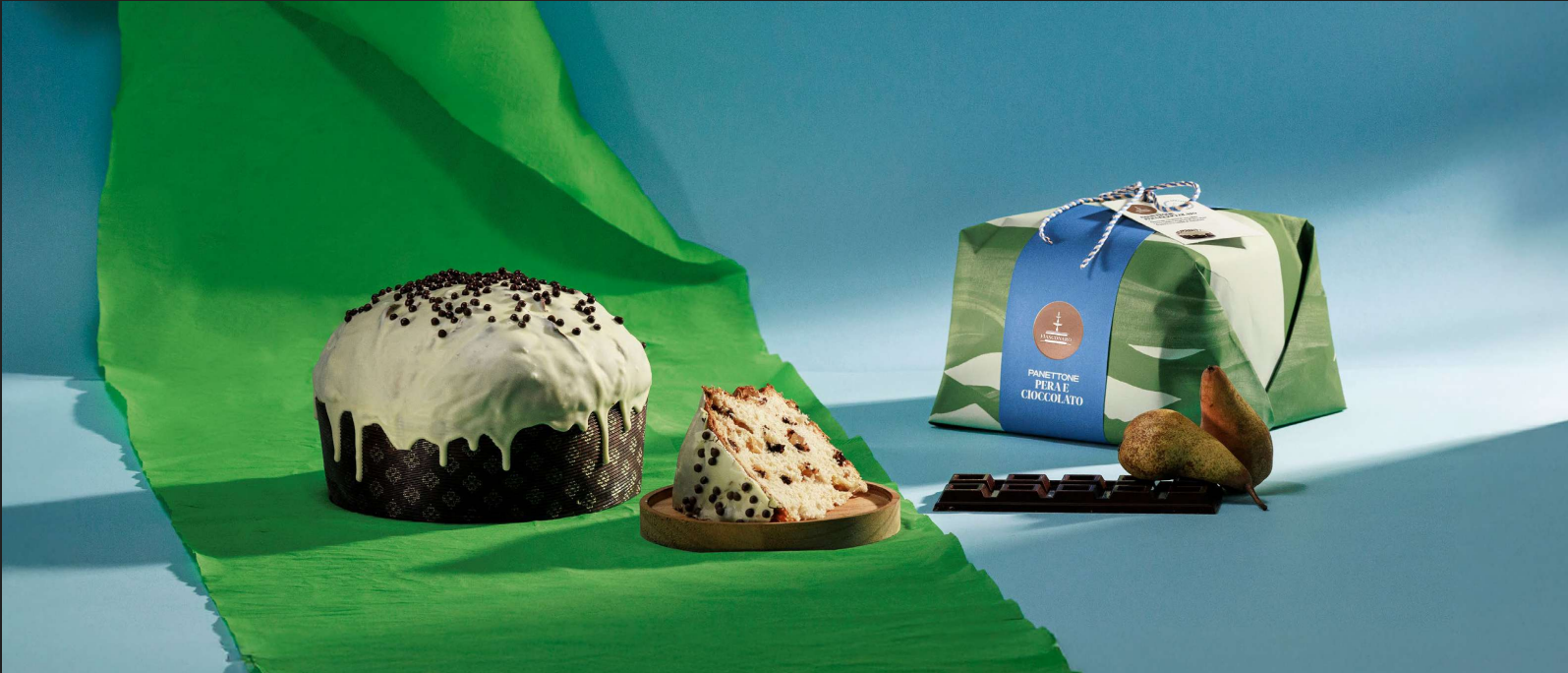 Panettone con canditi d'albicocca e“Cioccolato di Modica IGP”, ricoperto diglassa e fogliame di nocciole.