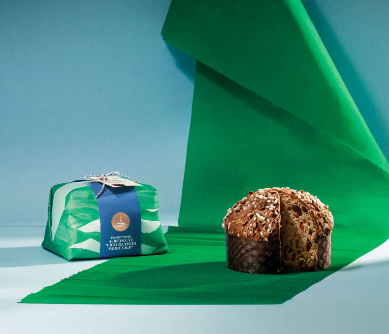 Panettone con canditi d'albicocca e “Cioccolato di Modica IGP”, ricoperto di glassa e fogliame di nocciole.